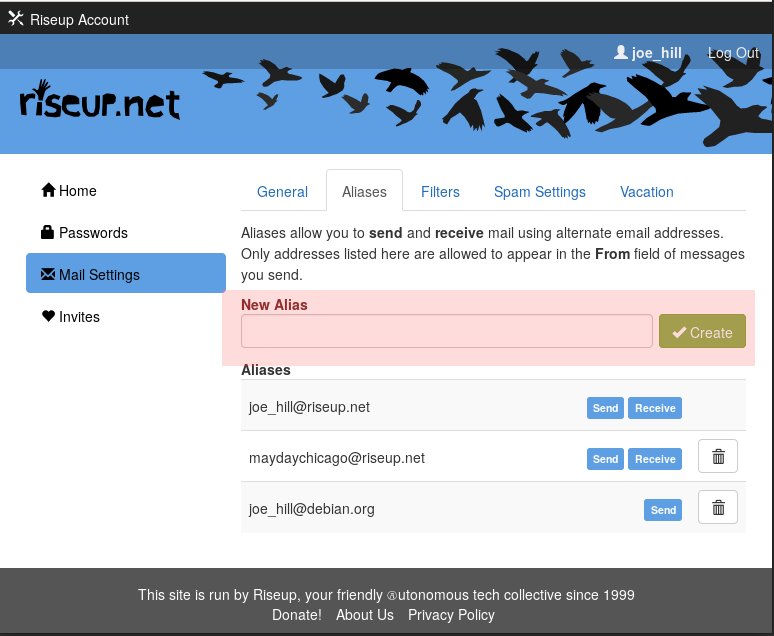 For example, your account might be joe_hill@riseup.net, but you want to use the address maydaychicago@riseup.net as the contact address for an action. Emails sent to the maydaychicago@riseup.net alias will go to your joe_hill@riseup.net mailbox.