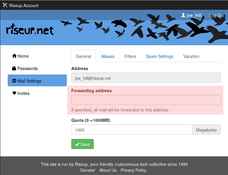 - Enter the address which you would like your riseup mail forwarded to in the field marked “Forwarding address”
