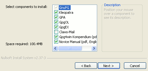 2. Choose the components you want to install. The default options are recommended. Claws-Mail is a powerful cross-platform email client available for Linux, Windows, Mac OS X, and others. GpgOL installs the plugin necessary to use OpenPGP keys with the Outlook mail client.