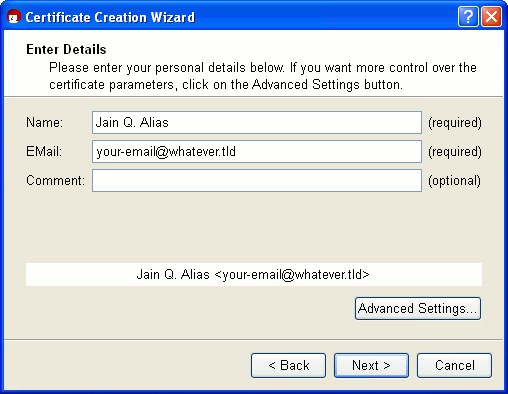 4. Enter your name, email address, and a comment if you wish. Your name and email address can be anything you want, not necessarily your real name or email address. If you want to use your OpenPGP key for encrypting email, put the email address you want to use with encryption in the “Email address” box. When finished, click the Advanced Settings… button.